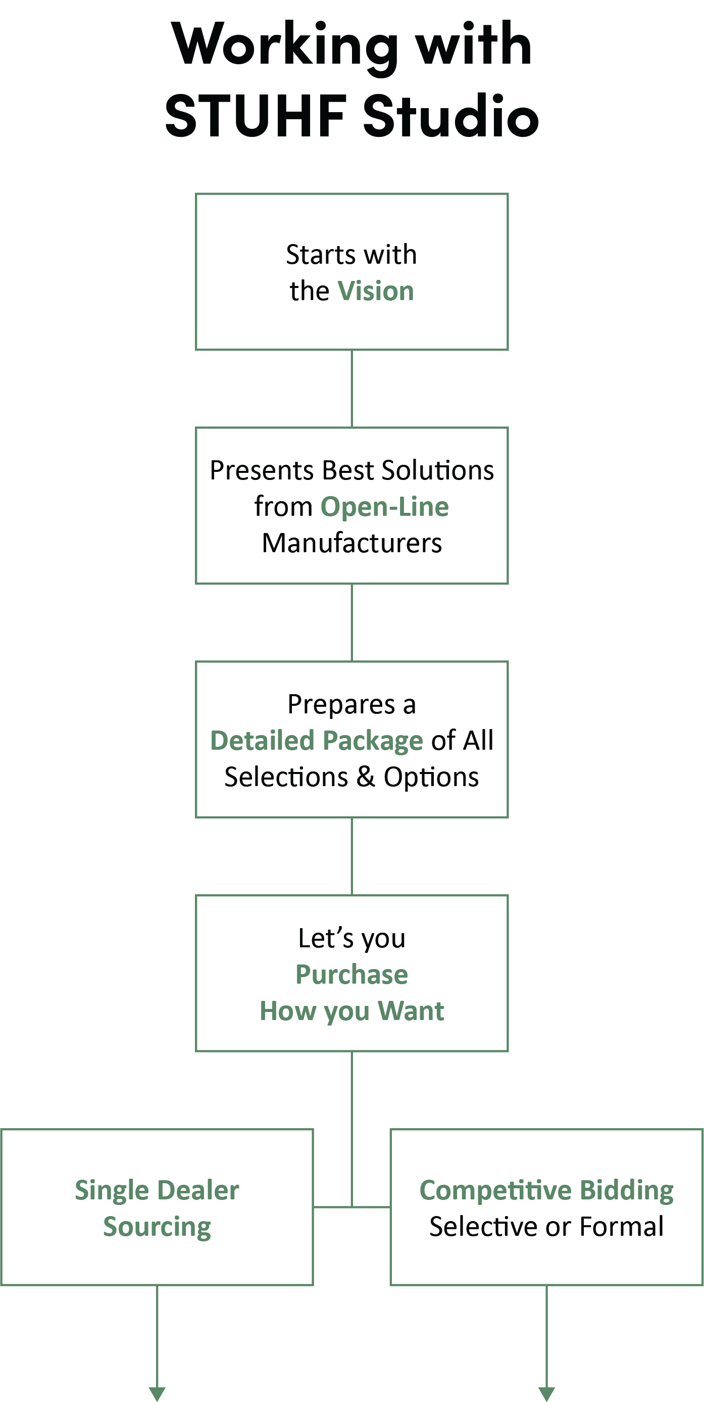 But the best part of this model is that we include procurement strategy as a standard approach to every project, empowering our clients to use our spec package to shop their best price, be it with STUHF or someone else. Which means…More Ways to Purchase and Competitive Pricing.